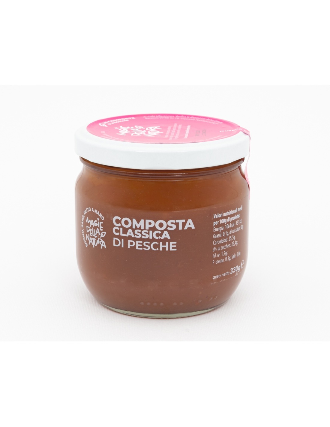 Ottenuta da pesche dolci e morbide, raccolte tra luglio e settembre quando il sole estivo ne esalta il profumo e la succosità. Lavoriamo la frutta con poco zucchero per mantenere vivo il gusto pieno e rotondo della pesca matura, trasformandola in una composta fresca, dal color dorato e naturalmente golosa.