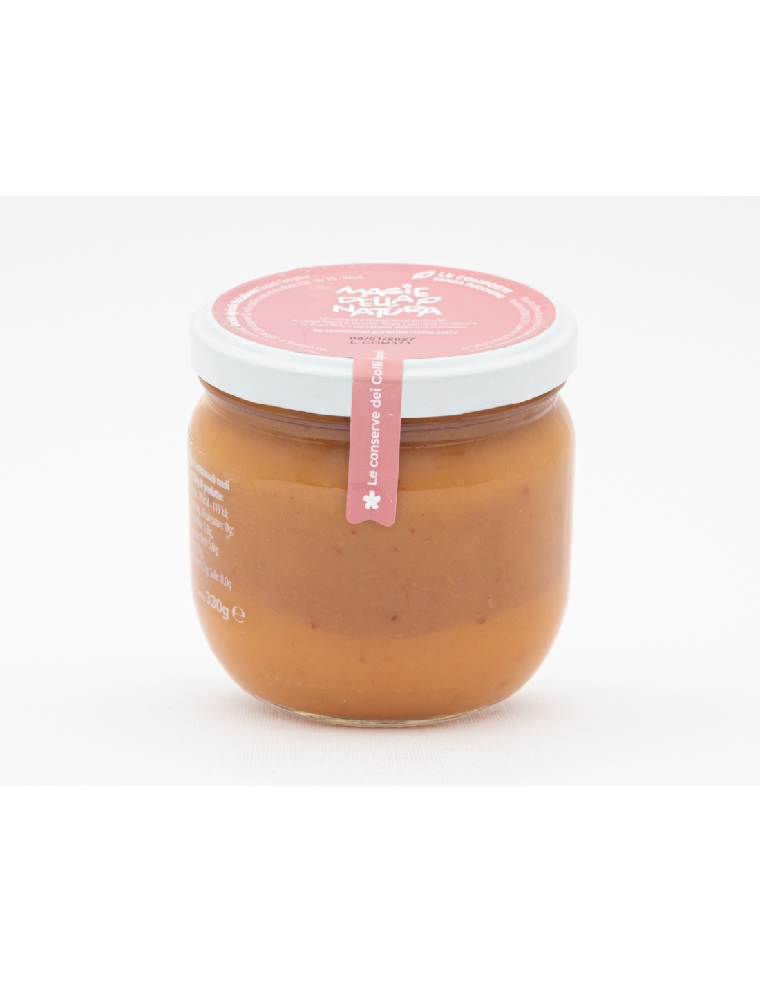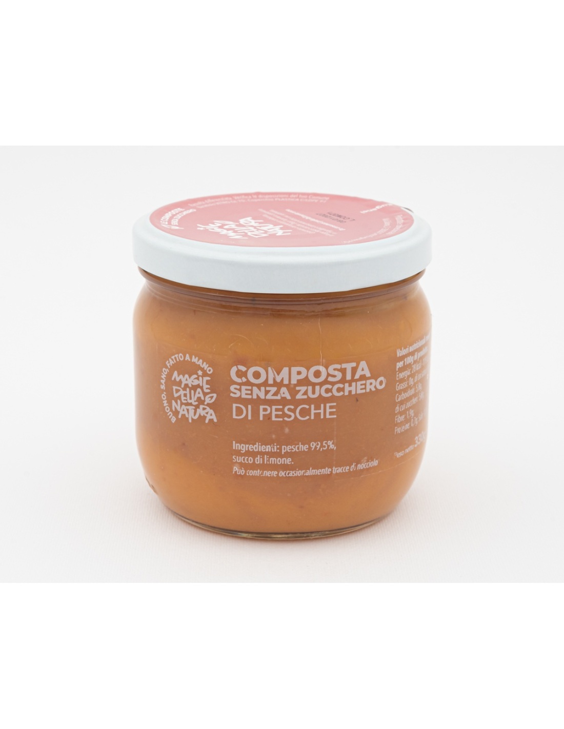 La composta di pesche è ottenuta da pesche mature e succose, senza zuccheri aggiunti. La dolcezza naturale del frutto, unita a una consistenza cremosa e vellutata, conserva tutto l'aroma fresco e profumato delle pesche estive.