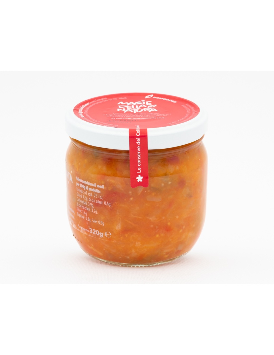 Una peperonata ricca e genuina, preparata esclusivamente con peperoni verdi, pomodoro, melanzane e cipolle coltivati nel territorio dei Colli Euganei. Lavorata con metodo artigianale, mantiene la consistenza morbida delle verdure e il loro sapore autentico, grazie a una cottura rispettosa degli ingredienti.