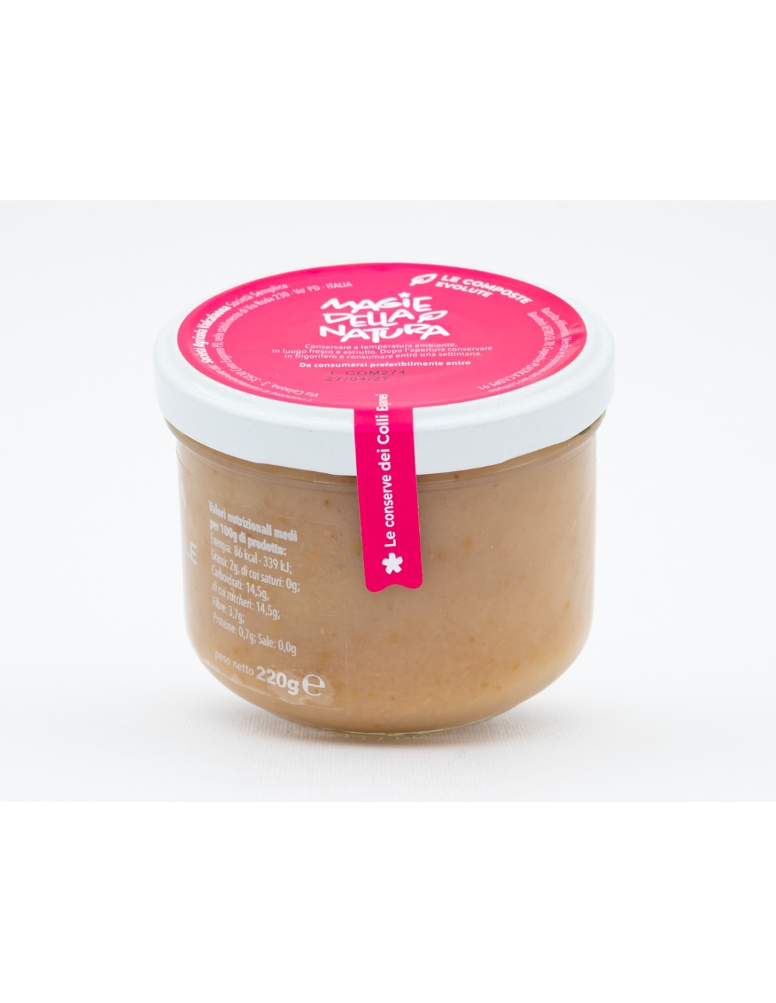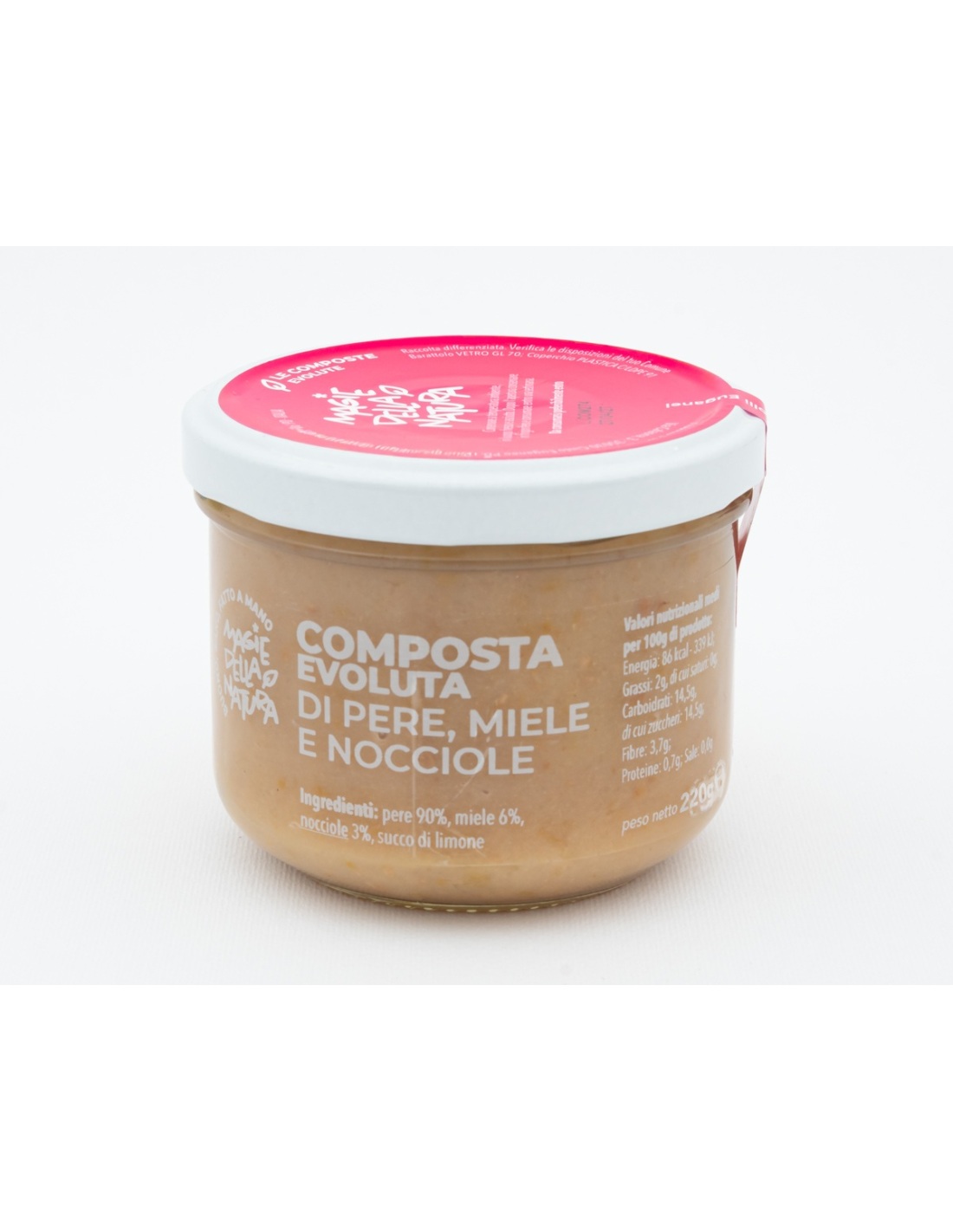 Una composta elegante e avvolgente, in cui la dolcezza succosa delle pere mature si unisce al profumo caldo e fiorito del miele millefiori, mentre la granella di nocciole tostati conferisce un tocco croccante e ricco. La purea di pere ha una consistenza morbida e vellutata, contrastata piacevolmente dalla granella, che aggiunge profondità tattile e un carattere rustico. Il miele dona un calore aromatico che esalta la frutta senza sovrastarla, trasformando ogni cucchiaino in un’esperienza raffinata e bilanciata.